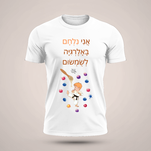 עזרו לילדכם להתמיד בטיפול החשיפה לשומשום או בשימורו, עם חולצת טריקו הנושאת את המשפט המעצים "אני נלחם באלרגיה לשומשום",